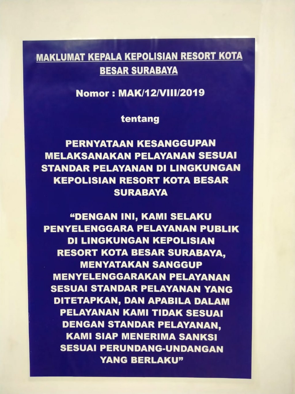 " DENGAN INI, KAMI SELAKU PENYELENGGARA PELAYANAN PUBLIK DI LINGKUNGAN KEPOLISIAN NEGARA RESORT KOTA BESAR SURABAYA, MENYATAKAN SANGGUP MENYELENGGARAKAN PELAYANAN SESUAI STANDAR PELAYANAN YANG DITETAPKAN, DAN APABILA DALAM PELAYANAN KAMI TIDAK SESUAI DENGAN STANDAR PELAYANAN, KAMI SIAP MENERIMA SANKSI SESUAI PERUNDANG-UNDANGAN YANG BERLAKU "