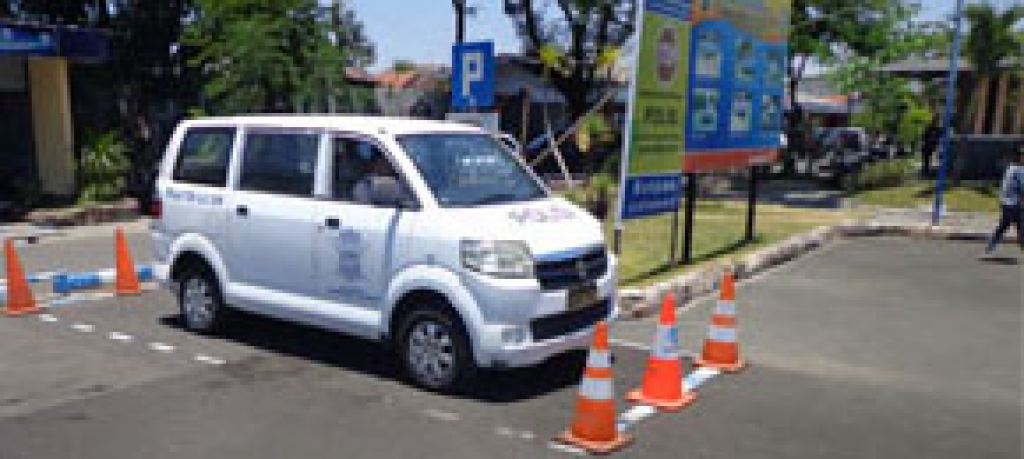 memarkir kendaraan bermotor uji seri dengan posisi serong, cara mundur sekali tepat pada posisi parkir yang baik, pergerakan tanpa menyentuh patok, ukuran tempat parkir 1,5 lebar kendaraan dan panjang 1,5 kali kendaraan bermotor uji