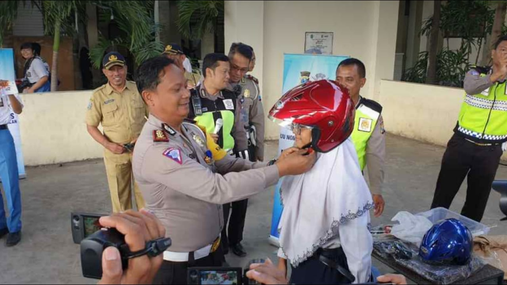 Tidak hanya Memberikan himbauan kasat lantas pun mebagikan helm kepada siswa siswi yang bisa menjawab pertanyaan dari pak kasat lantas AKBP Eva Guna Pandia.