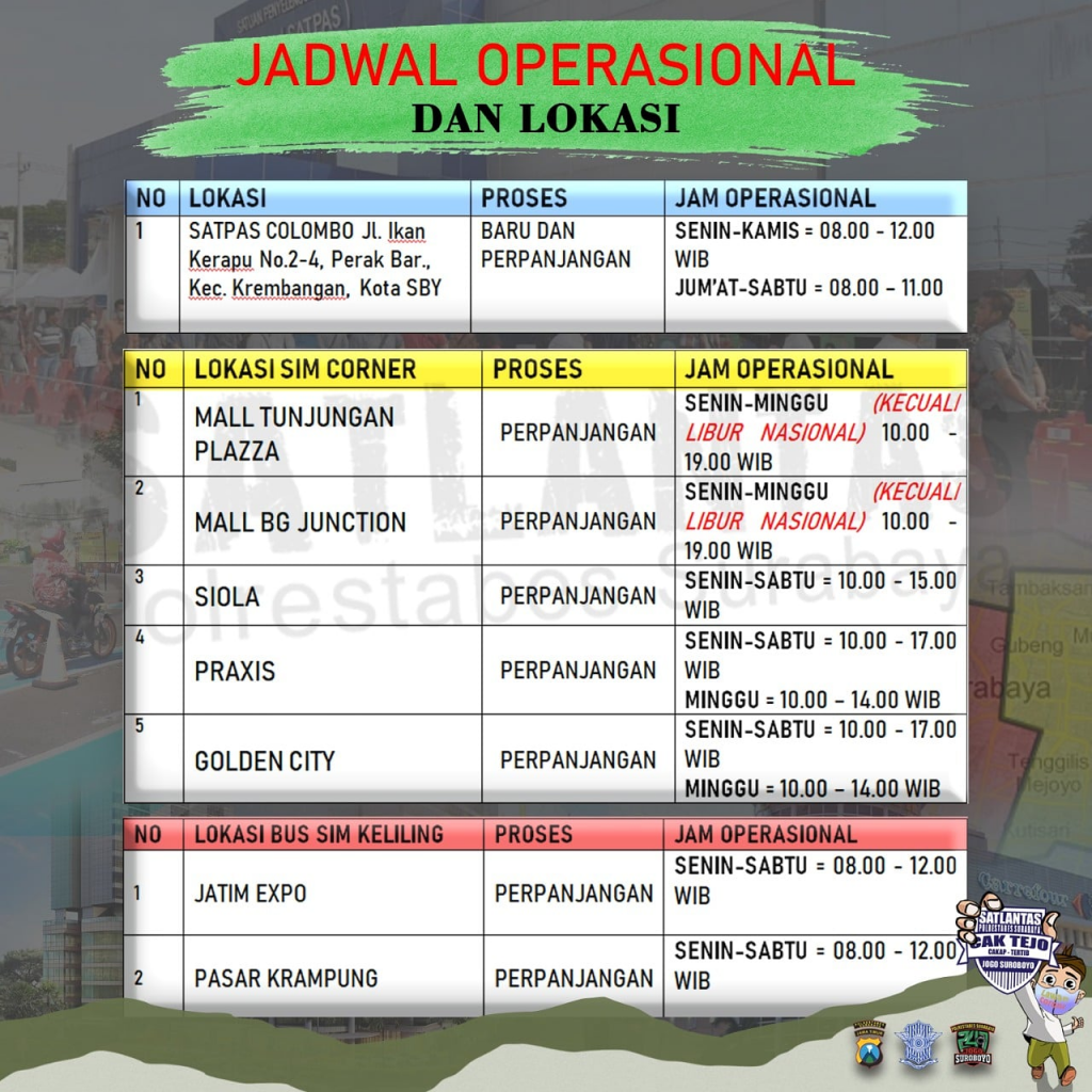 Berikut jadwal dan jam oprasional pelayanan satpas colombo hingga sim corner dan sim keliling di surabaya.