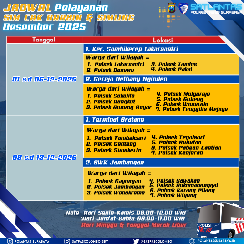 jadwal pelayanan perpanjangan Surat Izin Mengemudi (SIM) melalui program SIM Cak Bhabin dan SIMling (SIM Keliling) untuk periode 1 s.d 13 Desember 2025.