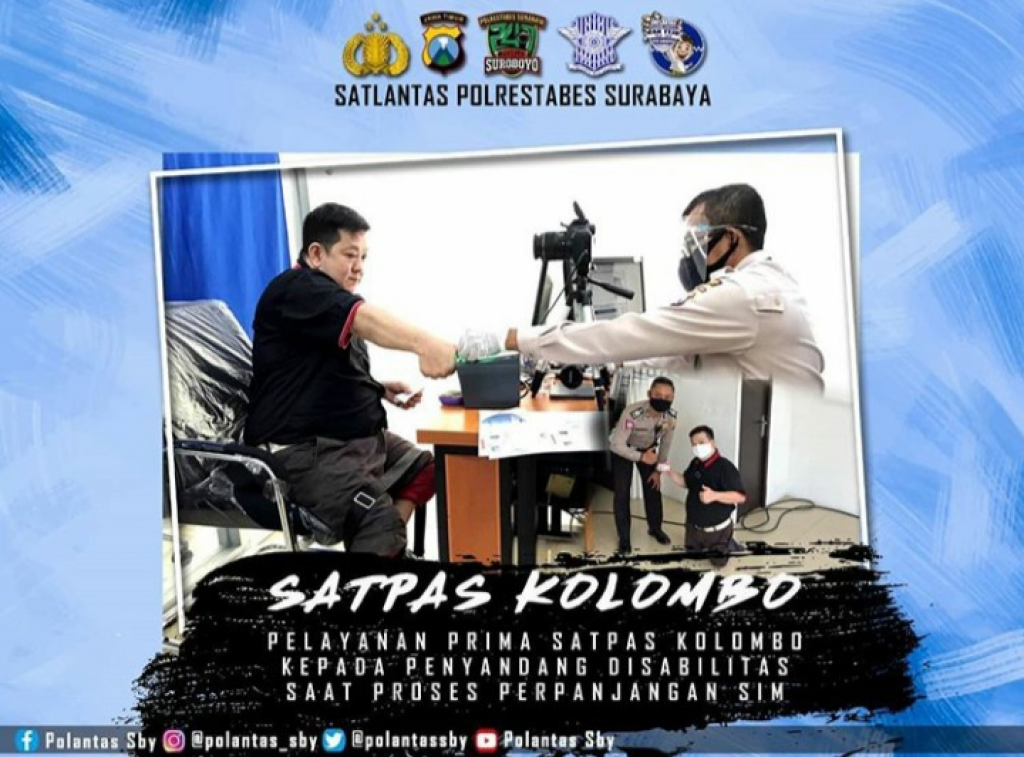 Satpas Colombo Satlantas Polrestabes Surabaya mendapatkan pemohon Disabilitas dengan proses perpanjangan dan langsung mendapatkan layanan prima dari petugas Satpas Colombo.