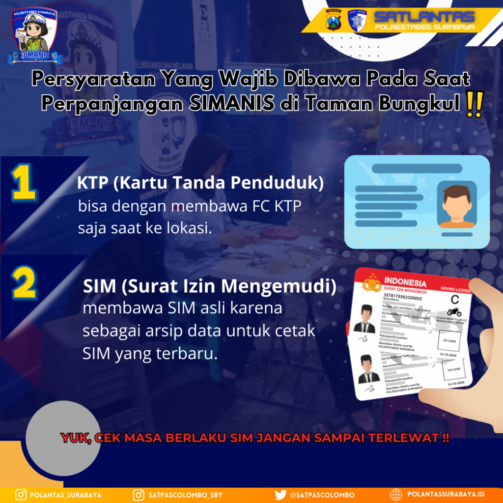 Satlantas juga mempermudah pelayanan perpanjangan SIM melalui program SIMANIS di Taman Bungkul dengan persyaratan yang jelas dan ringkas. Pemohon perpanjangan SIMANIS hanya wajib membawa fotokopi KTP dan SIM asli sebagai arsip data untuk pencetakan SIM baru.