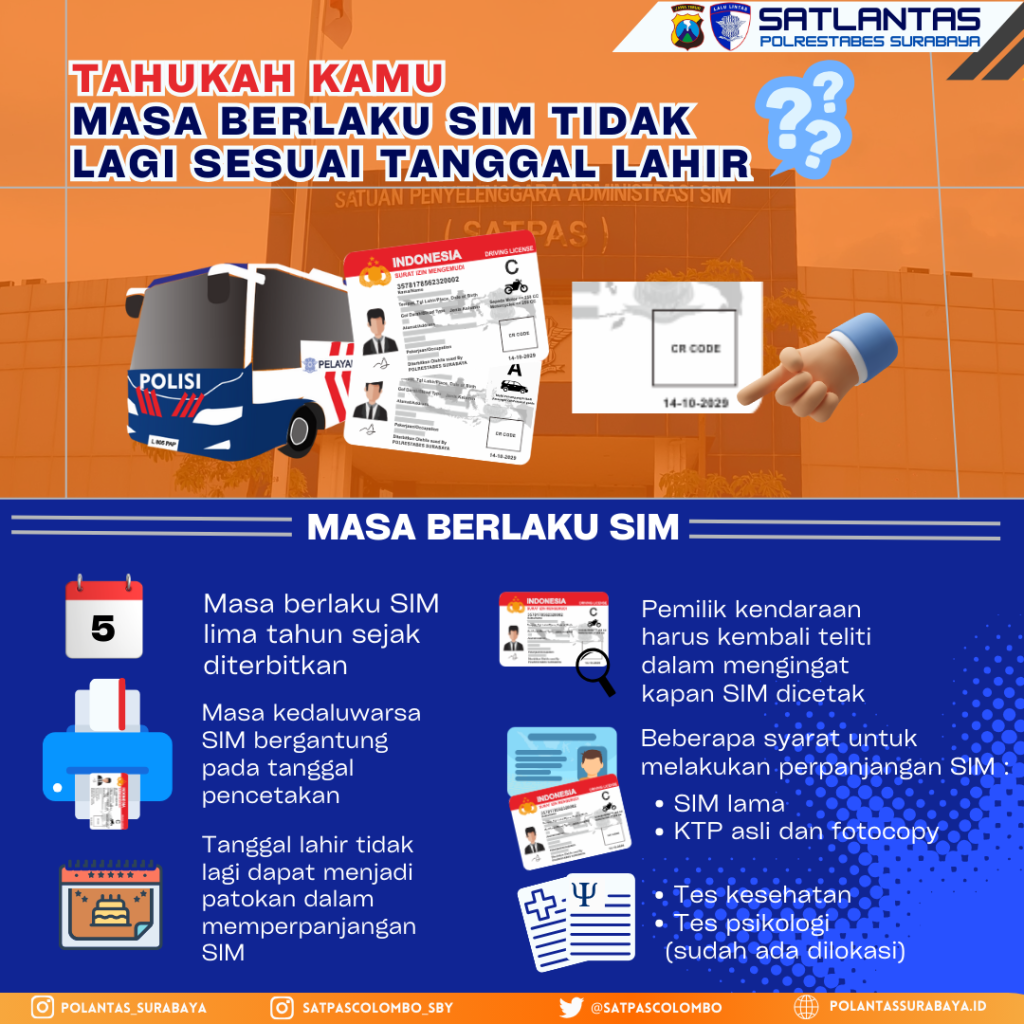 Penting: Aturan Masa Berlaku SIM Terbaru Masyarakat diingatkan bahwa masa berlaku SIM adalah lima (5) tahun sejak tanggal diterbitkan. Masa kedaluwarsa SIM kini bergantung pada tanggal pencetakan, bukan lagi tanggal lahir. Pemilik kendaraan harus teliti dan mengingat kapan SIM dicetak saat akan melakukan perpanjangan.
