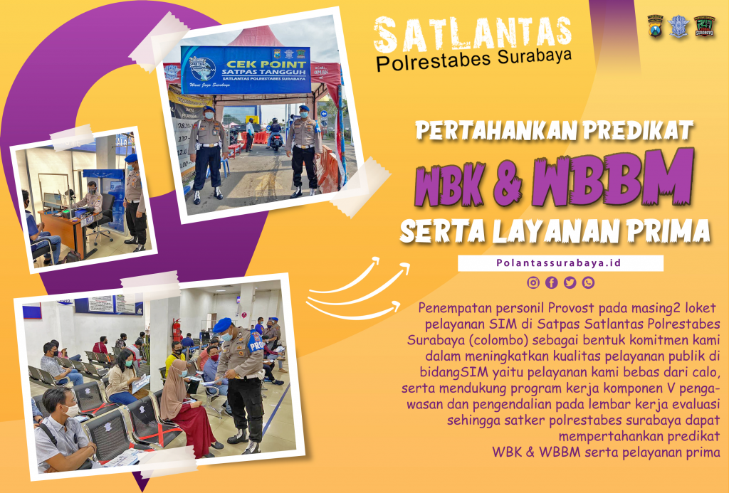 Penempatan personil Provost pada masing2 loket pelayanan SIM di Satpas Satlantas Polrestabes Surabaya (colombo) sebagai bentuk komitmen kami dalam meningkatkan kualitas pelayanan publik di bidang sim yaitu pelayanan kami bebas dari calo, serta mendukung program kerja komponen V pengawasan dan pengendalian pada lembar kerja evaluasi sehingga satker polrestabes surabaya dapat mempertahankan predikat WBK & WBBM serta pelayanan prima