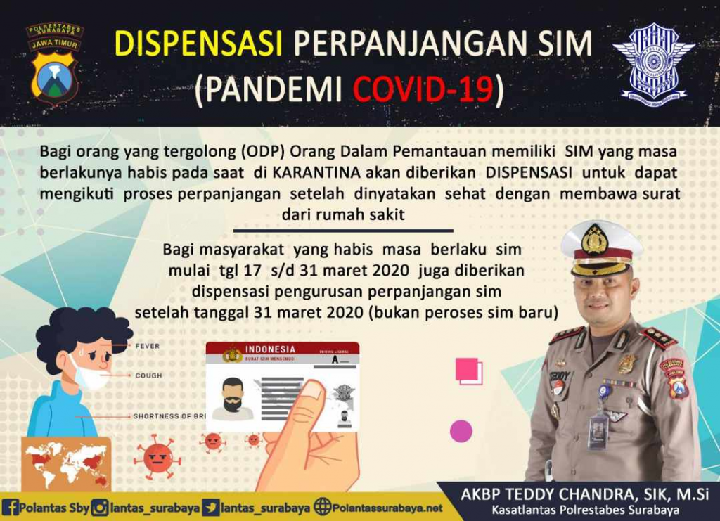 Semakin banyaknya korban yang terjangkit Virus Corona atau Covid 19, maka Satlantas Polrestabes Surabaya berikan dispensasi berupa waktu perpanjangan bagi orang atau pemohon yang sedang mengalami karantina atau orang dalam pemantauan (ODP) selama 17 maret s/d 31 maret 2020.