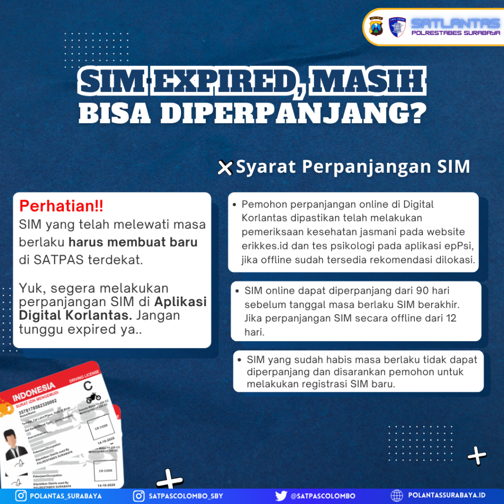 Pemohon diimbau segera melakukan perpanjangan SIM, baik secara online (melalui e-rikkes.id dan ePPsi.id) maupun offline, sebelum tanggal kedaluwarsa untuk menghindari proses pembuatan SIM baru.