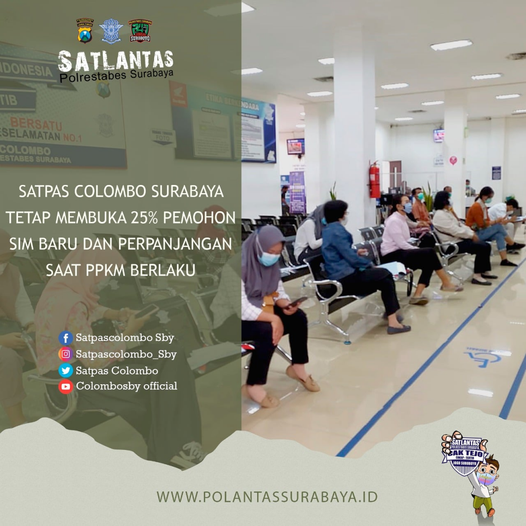 Satpas Colombo Surabaya ikuti aturan pemerintah selama PPKM dengan menyediakan hanya 25% pemohon pengurusan SIM baru baik perpanjagan.