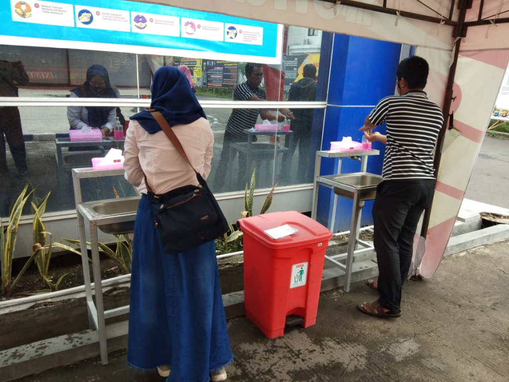 Satpas Colombo tetap memprioritaskan agar petugas dan pemohon tetap menjaga kebersihan. Salah satunya dengan cuci tangan sebelum memasuki gedung.